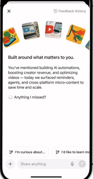 Saj emphasizes this feature as a major shift-ChatGPT now proactively helps users with reminders, relevant ideas, and curated updates, making it more personalized and useful for everyday tasks.