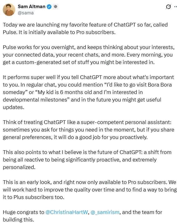 Sam Altman, on his X account, said ChatGPT Pulse is his favorite ChatGPT feature so far. He describes Pulse as a shift from reactive to significantly proactive and highly personalized AI, emphasizing that it works even better when users share their preferences and relevant details. This early preview will improve over time and is expected to eventually become available to Plus subscribers as well.